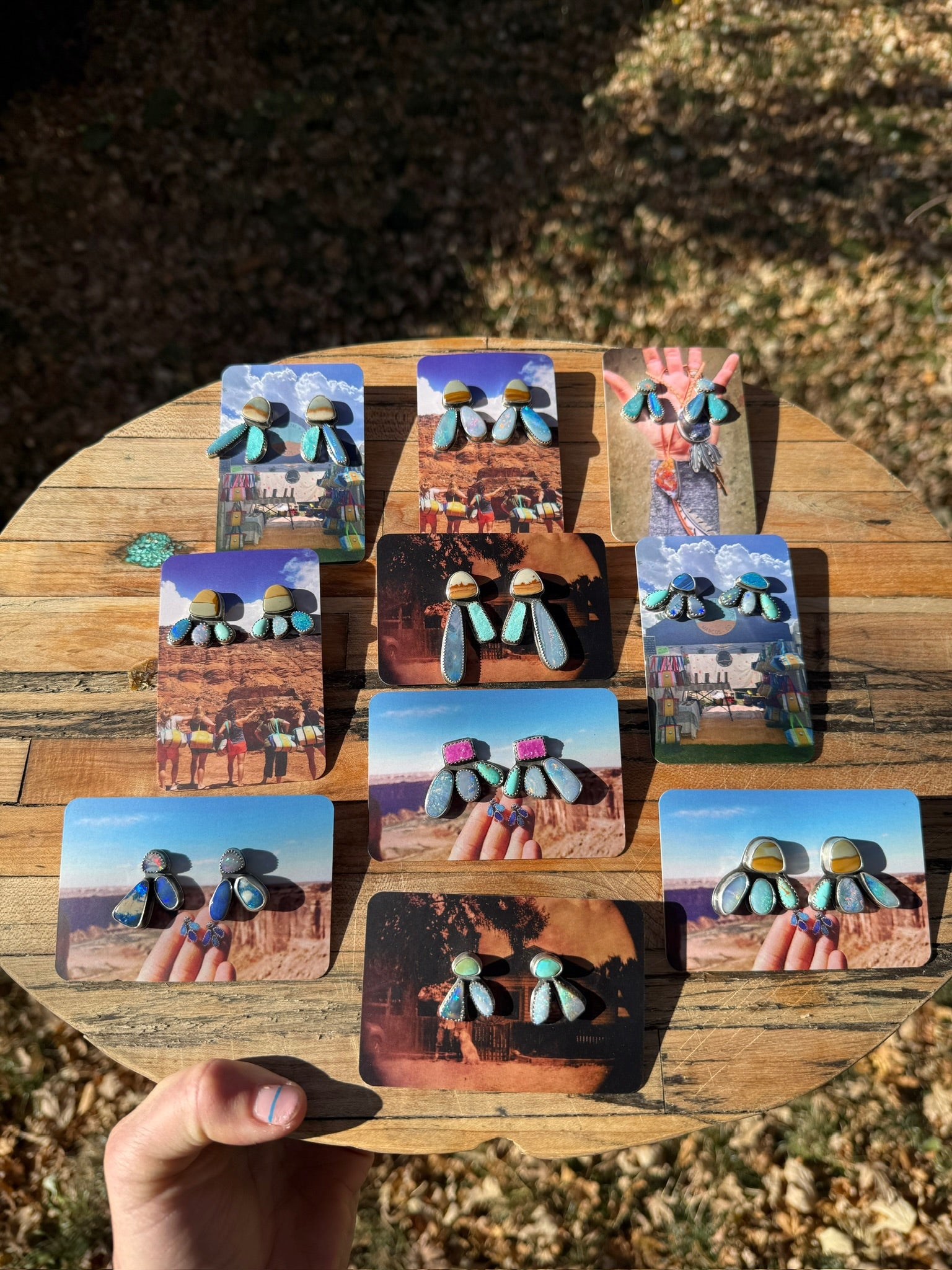 Jasper, turquoise + opal firefly earrings set in sterling silver. Sterling silver posts and earring backs. Patina finish.