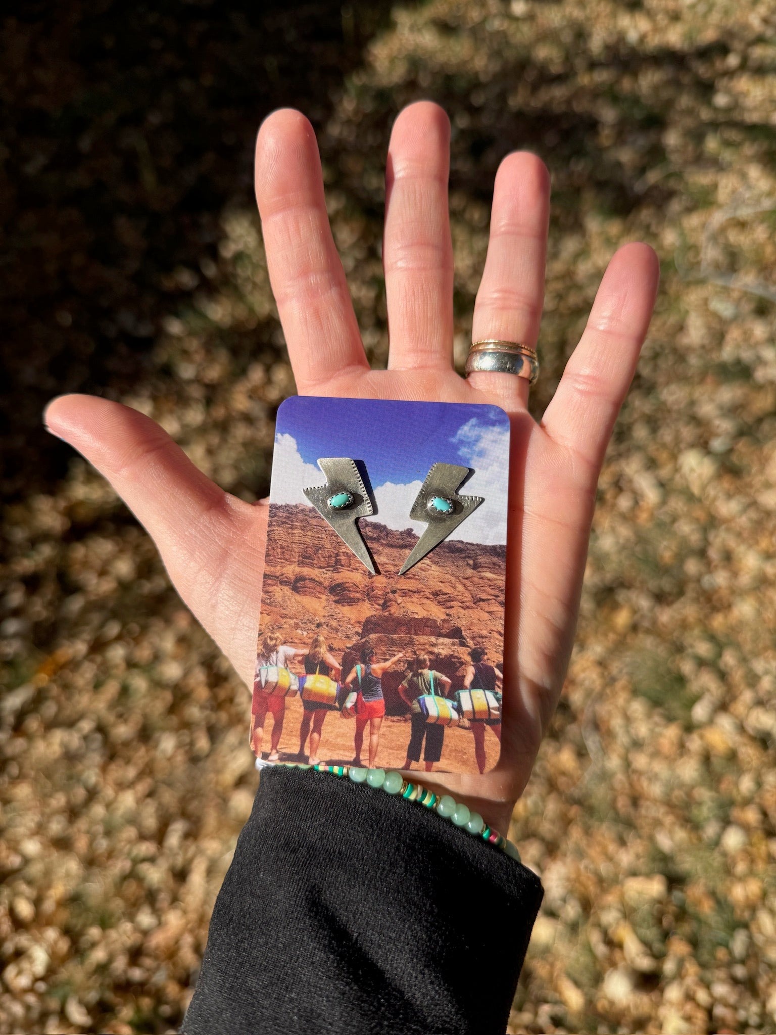 Lightning bolt shaped sterling silver with a hand stamped texture. Set with turquoise in sterling silver. Sterling silver posts and earring backs.